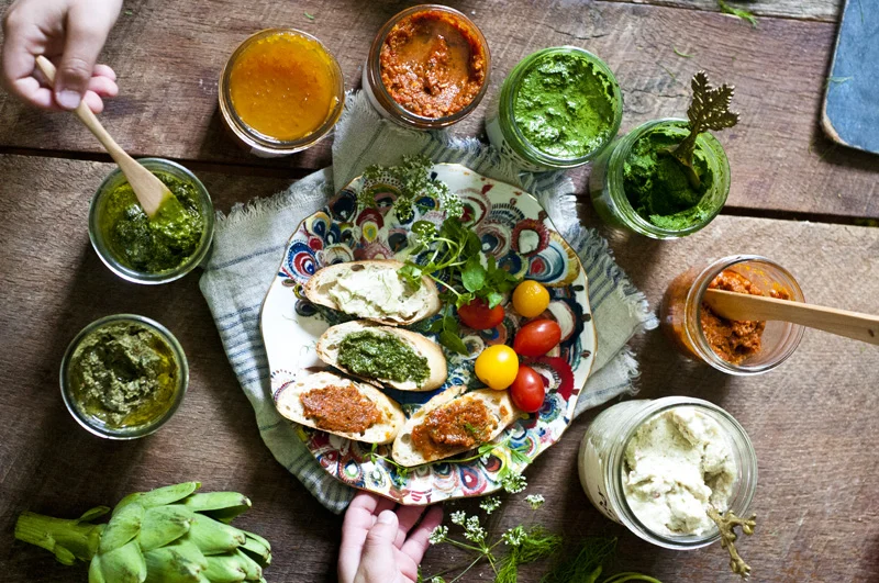 Jphanna's Nettle Pesto, Caitlin's Carrot Jam, Dried Tomato Pesto, Basil Pesto, Coliander Pesto, Artichoke Pesto