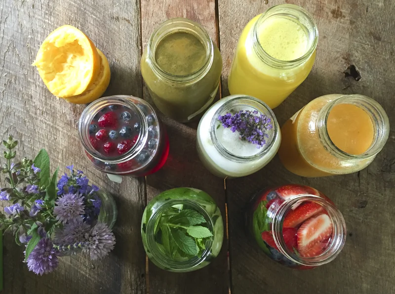 左上から、脂肪燃焼に!グリーンのファットバーンジュース、ココナッツ&パインジュース、マンゴー&ピーチジュース、ベリーのファットフラッシュウォーター、ミント&きゅうりのデトックスウォーター、チェリーベリージュース、ラベンダーレモネード(真中)